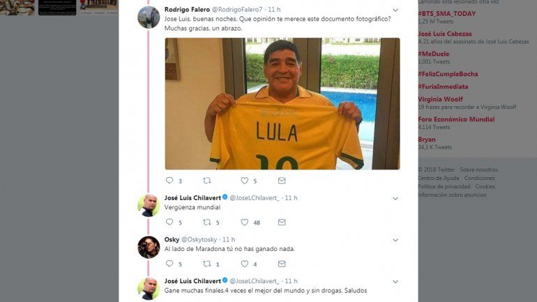 Acto seguido un seguidor le preguntó su opinión acerca de una imagen de Maradona sosteniendo una camiseta con el nombre de Lula en el dorsal de una camiseta de la selección brasileña. A lo que el polémico ex jugador calificó de "vergüenza mundial". Se lo chicaneó con que no había ganado nada en comparación con el astro argentino y Chila respondió: "Gané muchas finales, cuatro veces el mejor del mundo y sin drogas".