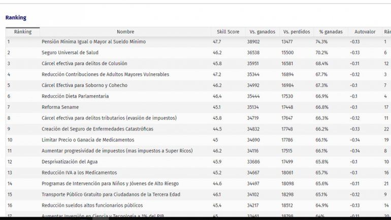El resultado de las selecciones es usado para crear una red de preferencias que se utiliza para establecer rankings de prioridades. Estos rankings de prioridades pueden ser luego analizados según diversas variables (sexo, edad, región, orientación política).