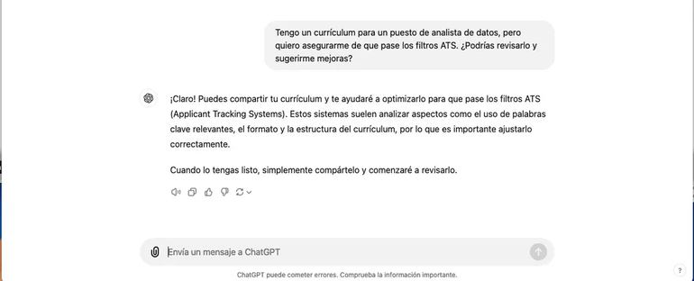 El CV es clave en la búsqueda laboral y el objetivo es resaltar por encima del resto, por ello, el ChatGPT estructura y mejora el curriculum vitae de manera efectiva. Puede personalizarlo para que sea compatible con los Sistemas de Seguimiento de Solicitantes asegurándote que pase los filtros automatizados en los procesos de selección que utilizan las empresas. Por ejemplo: Tengo un CV para un puesto de analista de datos, pero quiero asegurarme de que pase los filtros ATS, ¿podrías revisarlo y proponer mejoras?