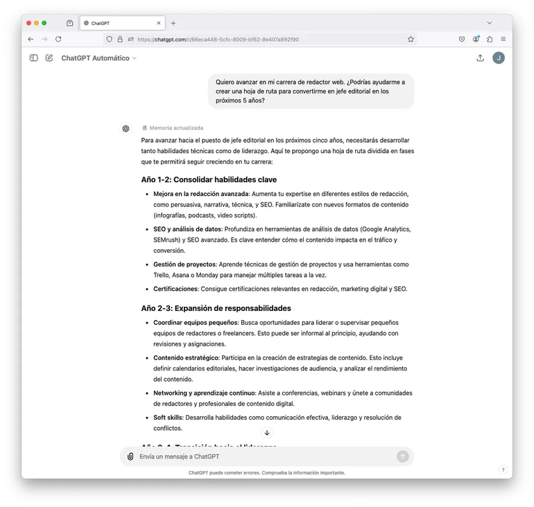 El ChatGPT puede guiarte en los pasos a seguir para avanzar en tu actual carrera o explorar nuevas áreas. Podés definir objetivos concretos y desarrollar un plan de acción, una especie, de visión a futuro de dónde querés estar. Por ejemplo: Quiero avanzar en mi carrera de redactor web. ¿Podrías ayudarme a crear una hoja de ruta para convertirme en jefe editorial en los próximos 5 años?