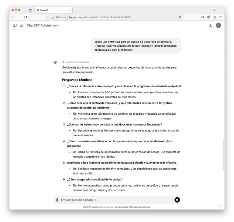 Más allá de la preparación sobre tus habilidades y competencias como así las debilidades, conocer la información de la empresa en la que buscás trabajar es clave. El chat te permite acceder a información valiosa sobre la compañía, desde su misión y valores hasta los proyectos más recientes. Por ejemplo: Mañana tengo una entrevista con una empresa llamada “X”. ¿Podrías darme un resumen sobre la historia y su relevancia en internet?