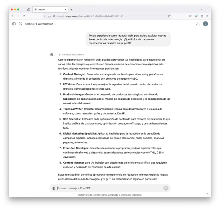 Cuando le brindás información sobre tu experiencia, el ChatGPT te sugiere roles que quizás no habías considerado y podrían ser ideales en tu búsqueda. Por ejemplo: Tengo experiencia en marketing digital, pero quiero explorar nuevas áreas dentro de la tecnología. ¿Qué títulos me recomendarías basados en mi perfil?
