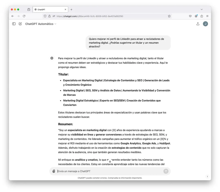 Hoy la mayoría de los reclutadores está en LinkedIn, que se convirtió, sin dudas, en la red social por excelencia para conectar con empleadores. Tener un perfil optimizado es clave para destacarse. Con la ayuda del ChatGPT podés crear un perfil impactante, desde la redacción hasta la mejora en las secciones de experiencias y habilidades. Por ejemplo: Quiero mejorar mi perfil de LinkedIn para atraer a reclutadores de marketing digital. ¿Podrías sugerirme un titular y un resumen atractivo?.