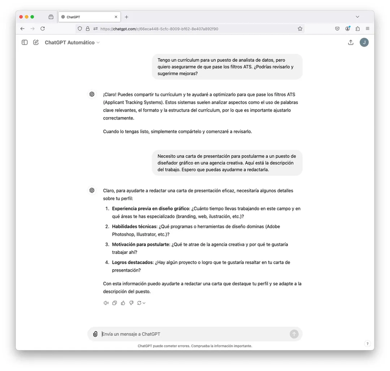 Una carta genérica no siempre es la mejor opción, por eso el ChatGPT te ayudará a redactarla completamente personalizada para cada aplicación. Capta el estilo de la empresa y el tono en la redacción para que sea atractiva. Por ejemplo: Necesito una carta de presentación para postularme a un puesto de diseñador gráfico de una agencia creativa. Te describo el trabajo. Espero puedas ayudarme a redactarla.
