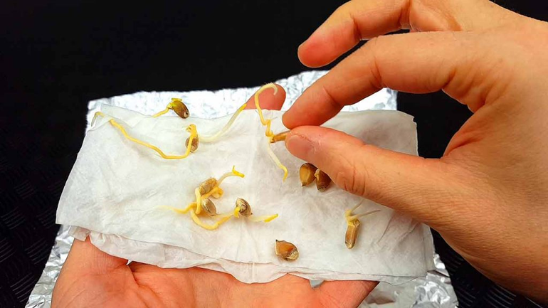 El segundo método implica colocar las semillas entre dos hojas de papel humedecido, dentro de un recipiente hermético. Es importante que las semillas estén separadas entre sí por al menos un centímetro, a fin de reducir el riesgo de proliferación de hongos si alguna llega a infectarse.