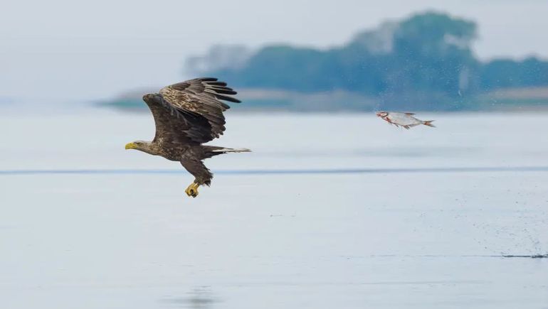 Por otro lado, en la categoría de peces y otras especies acuáticas, la imagen ganadora fue tomada por Przemyslaw Jakubczyk y muestra a un pez aparentemente cansado de huir, ahora cazando un águila calva. Esta fotografía juega con la inversión de roles y ofrece una visión curiosa de las relaciones entre especies animales.