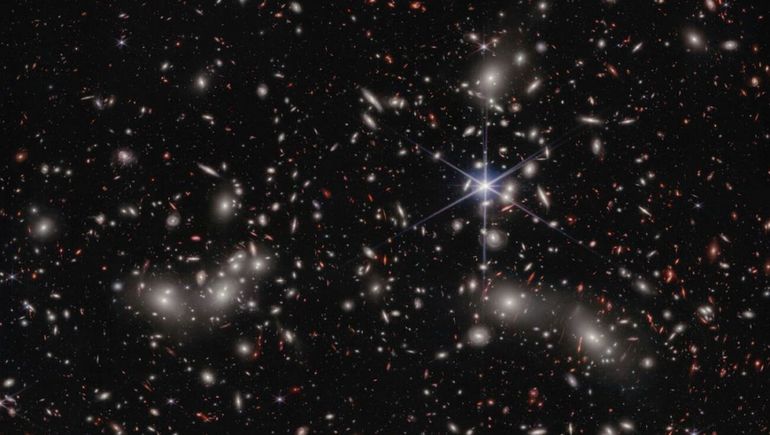 El telescopio espacial James Webb capturó una foto con 50.000 astros. Los puntos blancos son galaxias del cúmulo de Pandora que muestran efectos de lente gravitacional; los rojos están distorsionados y con formas irregulares porque se encuentran a gran distancia.