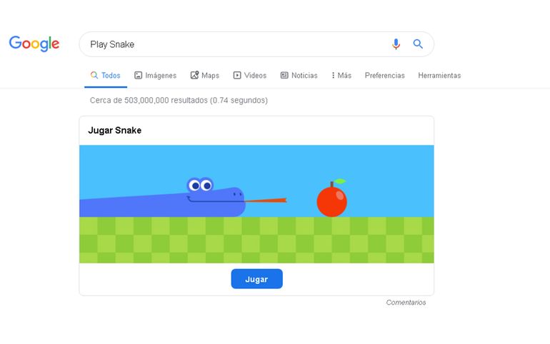 Snake es uno de los videojuegos más conocidos que Google ofrece para momentos de entretenimiento. Este clásico se hizo popular en los teléfonos celulares antiguos y permite a los usuarios guiar una serpiente de un lado a otro de la pantalla para que se va alimentando de una manzana que aparece en cualquier lugar y que hace que el animal se vaya alargando y aumentando su velocidad. A medida que la serpiente se alarga, el desafío aumenta.