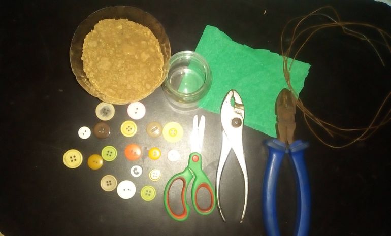 Necesitarás: botones, rollo de hilo, palo de brochette, alambre, pintura en aerosol, pegamento.