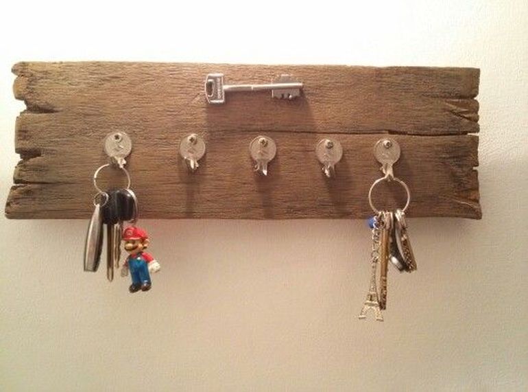 Otra forma útil y original de reutilizar llaves consiste en convertirlas en ganchos para colgar otras llaves. Esta idea combina funcionalidad y estilo rústico.