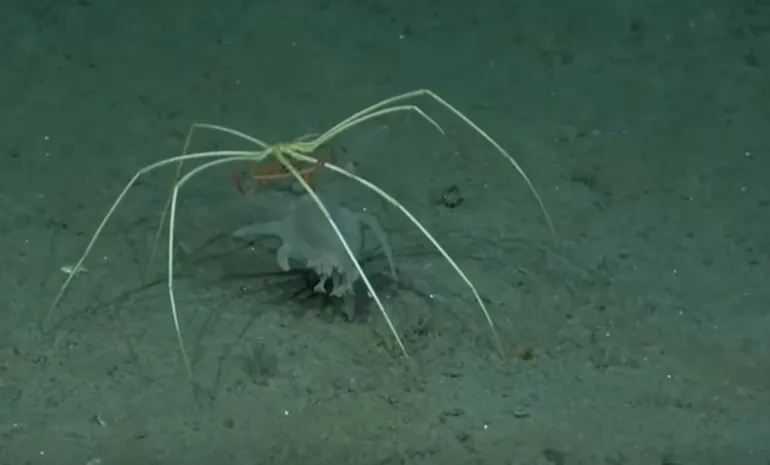 Uno de los momentos más impactantes del streaming estuvo protagonizado por una araña marina del género Colossendeis, observada mientras se alimentaba de un pepino de mar suspendido bajo su cuerpo. Estos arácnidos marinos se caracterizan por patas extremadamente largas y un cuerpo reducido, y habitan mares fríos del hemisferio sur. Un rasgo distintivo de su biología es que los machos transportan los huevos adheridos a sus patas, una estrategia reproductiva poco habitual.