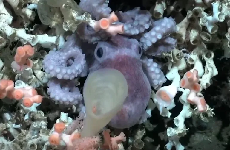 La expedición también permitió registrar la presencia de un pulpo dumbo, nombre común que agrupa a especies del género Grimpoteuthis. Estos cefalópodos viven entre los 1000 y los 4000 metros de profundidad y se desplazan gracias al suave movimiento de aletas laterales, lo que reduce el gasto energético.