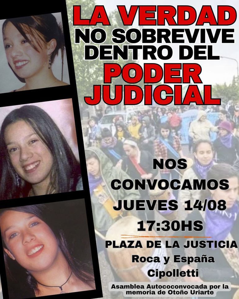 Mañana jueves 14 de agosto, los familiares y amigos de Otoño Uriarte, junto con organizaciones sociales, convocan a una manifestación para exigir justicia a raíz de la reciente absolución de los cuatro imputados por su femicidio. “No hay justicia en los tribunales, pero sí en las calles” es el lema que representa esta nueva marcha que tendrá lugar en la Plaza de la Justicia en Cipolletti.