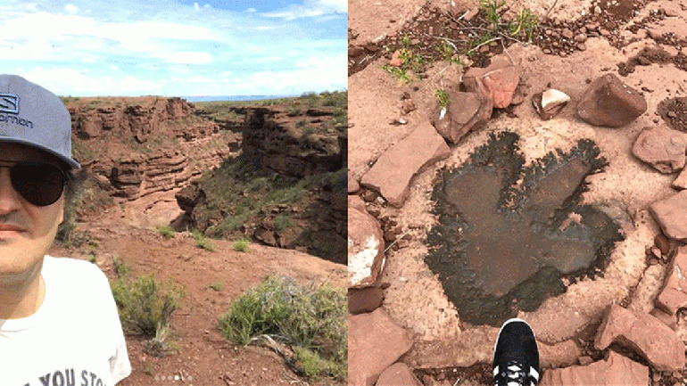 "(Tb foto en el Cañadón Escondido). Neuquén y Río Negro", añadió en el posteo donde mostró fotos de su pie con una huella de dinosaurio.