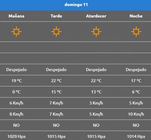 El clima de este domingo estará un poco más frío que es de este sábado 10 de octubre en el territorio provincial. El amanecer fue a las 06:51, y oscurecerá a las 19:48. En este sentido, el servicio indicó que aunque el cielo estará totalmente despejado y la probabilidad de que llueva es del 0 por ciento para el transcurso de la mañana. En cuanto a la temperatura mínima pronosticada para este domingo será de 0 grados Celsius, y el registro máximo que se alcanzaría hoy sería de 22 grados Celsius.
