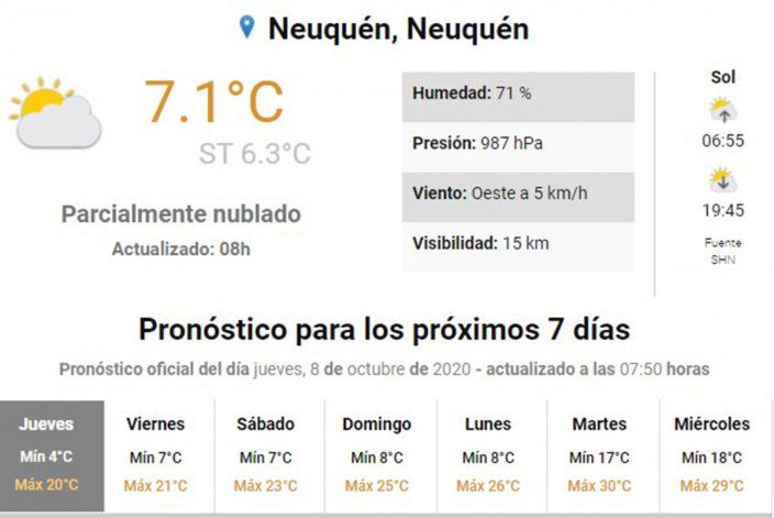 Para la publicación de esta nota, actualizada a las 8:00 horas, la temperatura en Neuquén era de 7.1 grados Celsius, con un clima parcialmente nublado, con una visibilidad de 15 kilómetros y la humedad del 71 por ciento.