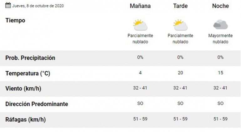 Luego de entrar en horas de la tarde, la temperatura aumentará significativamente y alcanzará su máxima con 20 grados Celsius. Asimismo, se estima que la tarde de este viernes los vientos del sector norte alcancen una velocidad máxima de 41 kilómetros por hora. El Servicio Meteorológico Nacional (SMN) informó que el porcentaje de probabilidad de precipitaciones sobre la provincia se mantiene en 0.