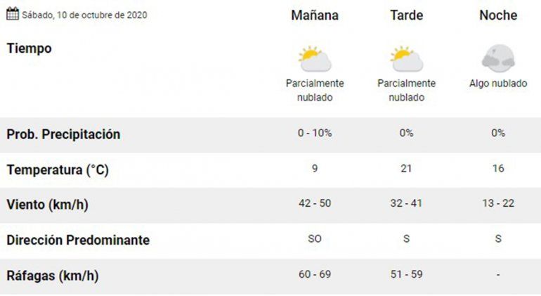 Luego de entrar en horas de la tarde, la temperatura aumentará significativamente y alcanzará su máxima con 21 grados Celsius. Asimismo, se estima que la tarde de este sábado los vientos del sector norte alcancen una velocidad máxima de hasta 41 kilómetros por hora. El Servicio Meteorológico Nacional (SMN) informó que el porcentaje de probabilidad de precipitaciones sobre la provincia para la tarde es 0.