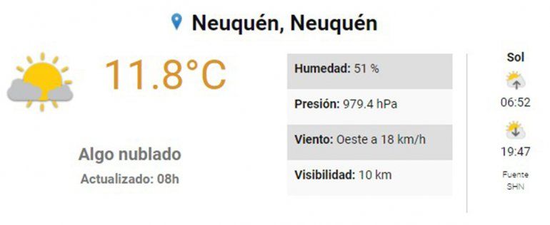 Para la publicación de esta nota, actualizada a las 8:00 horas, la temperatura en Neuquén era de 11.8 grados Celsius, con un clima algo nublado, una visibilidad de 10 kilómetros y la humedad del 51 por ciento.