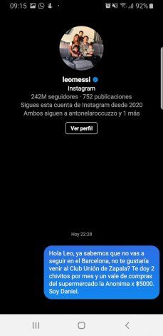 "Hola Leo, ya sabemos que no vas a seguir en el Barcelona, ¿no te gustaría venir al club Unión de Zapala?. Te doy dos chivitos por mes y un vale de compras en el supermercado La Anónima por $ 5000. Soy Daniel", publicó el fana.