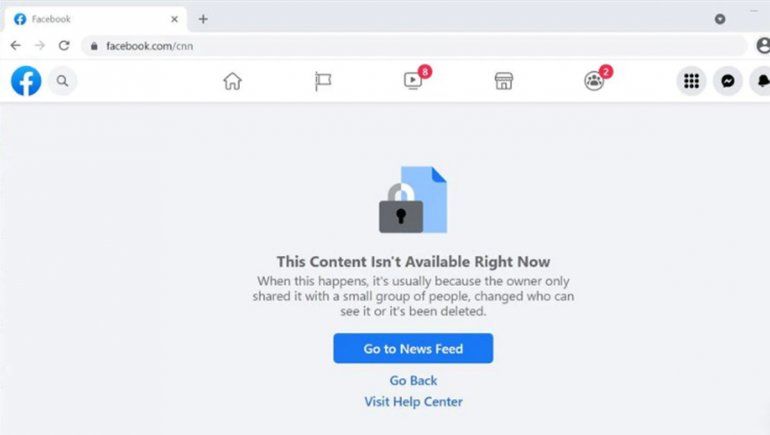 La página principal de CNN en Facebook mostraba un mensaje de error cuando se accedía a ella desde Australia el miércoles. La organización de noticias estadounidense dijo que Facebook declinó una solicitud para ayudarla a ella y a otros editores a deshabilitar los comentarios públicos en el país tras el fallo, que se produjo durante una demanda por difamación en curso.