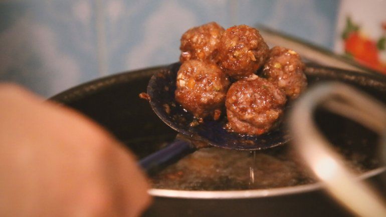 - Para las albóndigas: amasar con las mano la carne hasta que esté bien uniforme. Cortar los morrones y la cebolla bien chiquitos e incorporarlos a la carne picada. Condimentar.Hacer doce bolitas parejas.Freír en abundante aceite de girasol.