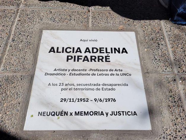 "Alicia era un ángel, le dolía la pobreza y luchaba por un mundo mejor, por eso la esperaron agazapados para llevársela", afirmó Sara Mansilla, presidenta de la Asamblea por los Derechos Humanos (APDH) de Neuquén, durante el acto en el que se colocó una baldosa en homenaje a Alicia Pifarré, secuestrada el 9 de junio de 1976, a los 23 años, durante la última dictadura militar y desde entonces se encuentra desaparecida.