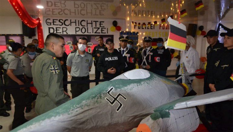 Otra imagen muestra a numerosos policías, al menos tres de ellos con atuendo nazi, examinando una replica de un Messerschmitt Me 262 de de papel maché adornado con una esvástica. En el fondo se lee "geschichte der polizei" en alemán: "la historia de la policía".