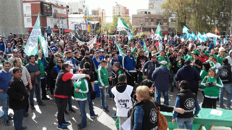 Los trabajadores nucleados en los gremios que agrupan la CTA y la CGT colman el Monumento a San Martín luego de marchar por el centro de la ciudad en repudio de las políticas de “ajuste” del gobierno nacional que dirige Mauricio Macri.