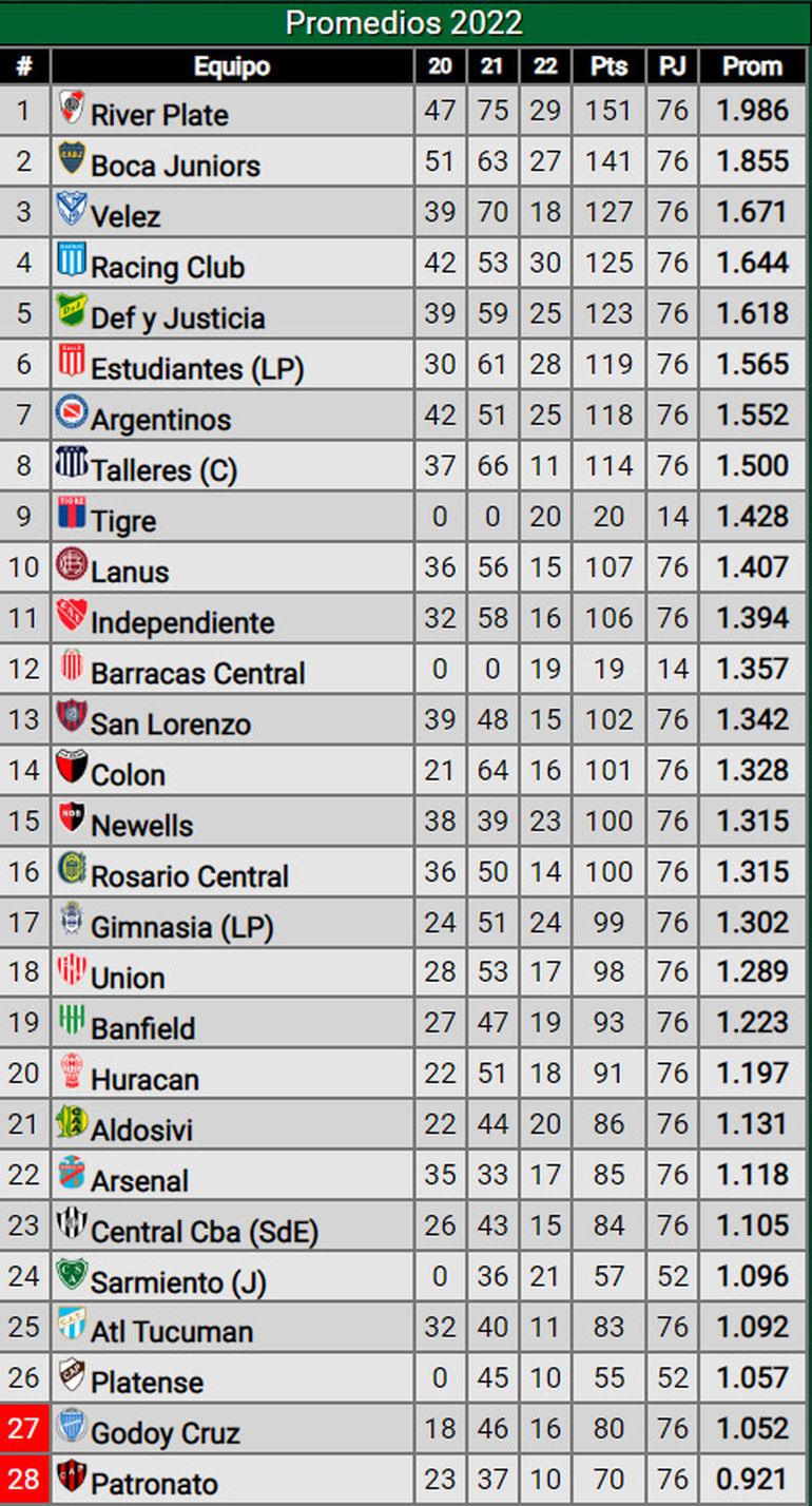 Como de costumbre, los dos equipos que dejarán la Primera División lo harán a través de la tabla de los promedios, la cual contabiliza los puntos que hayan sacado en las última tres campañas. Al momento, quienes ocupan esos lugares son Patronato con 70 puntos en 76 partidos (0.921) y Godoy Cruz con 80 en 76 encuentros (1.052).