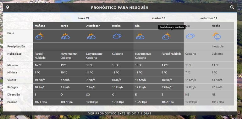 Para el martes se esperan condiciones climáticas similares. La temperatura seguirá en descenso, la máxima estará en los 18 grados y la mínima en 11 grados durante el día. El cielo pasará de estar mayormente cubierto a parcialmente nublado. Hacia la noche la temperatura descenderá a una máxima de 13 y una mínima de 8 grados.