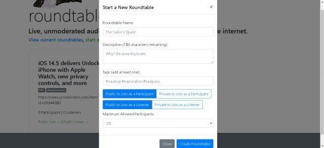 Ese mismo auge ha impulsado a otras plataformas a incorporar salas de voz al estilo Clubhouse, como esta alternativa llamada Roundtable, con salas para conversaciones de audio en vivo gratis y rápido. Para usar Roundtable no necesitás registrarte. Tiene una interfaz re sencilla de usar. Allí podés ver cuáles son las salas públicas activas o también tenés la posibilidad de crear una para concentrar a un número determinado de participantes.