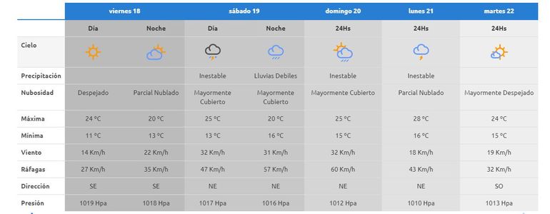 Por último, el domingo permanecerán las condiciones y la máxima se mantendrá en 25 grados. En tanto, se espera que el viento esté presente toda la jornada y las ráfagas podrían alcanzar los 60 kilómetros por hora.