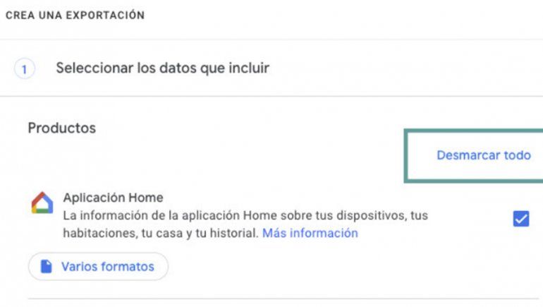 Para acceder al contenido primero hay que ir Google Takeout. Desde esta página se pueden descargar copias de seguridad de los servicios de Google, entre ellos Google Fotos. Una vez en la página, se deberá pulsar en 'desmarcar todo', ya que es la opción que viene activa por defecto.