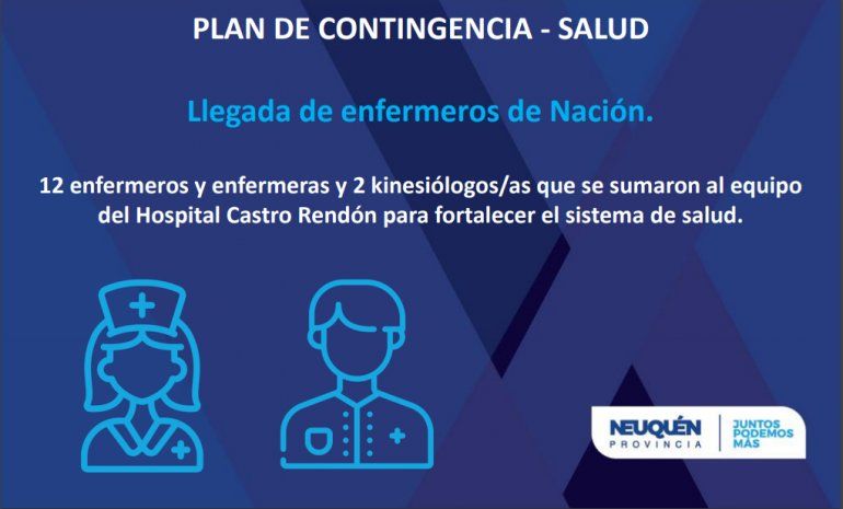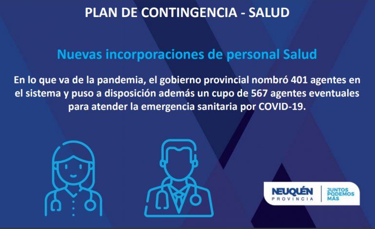 Entre las nuevas medidas se destacan el nombramiento de más de 400 agentes en el sistema sanitario, que se sumaron a otros 567 eventuales para atender la emergencia por COVID-19. Además, llegaron 12 enfermeros y enfermeras y 2 kinesiólogos/as para el Hospital Castro Rendón.