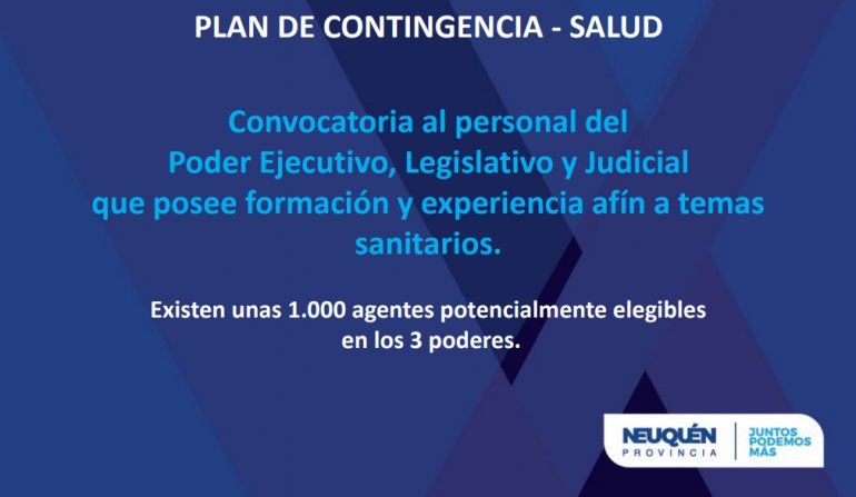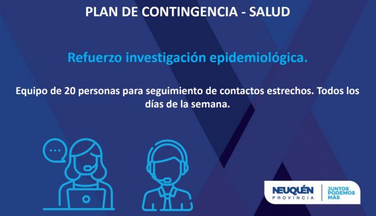 Entre otras de las medidas, el Plan de Contigencia el gobierno convocó a médicos y médicas jubilados del Sistema de Salud de la provincia para realizar trabajo territorial bajo modalidad virtual, y se instrumentó un refuerzo en la investigación epidemiológica con 20 personas para seguimiento de contactos estrechos todos los días de la semana.