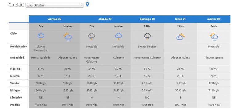 En Las Grutas, el fin de semana comienza con lluvia. Desde la AIC pronostican días con algunas tormentas débiles pero temperaturas agradables que podría incluso superar los 30 grados.