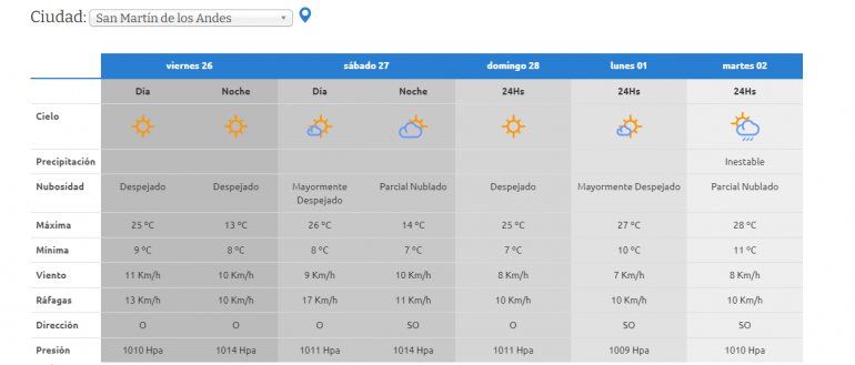 En San Martín de los Andes, Villa La Angostura y Villa Pehuenia y alrededores, la AIC pronostica un viernes con buen tiempo, la máxima rondará los 25 grados con sol y sin probabilidades de precipitaciones ni vientos fuertes.