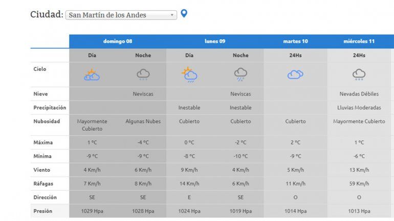 En Junín de los Andes el viernes se presenta con neviscas débiles y precipitaciones, con una máxima de un grado y una mínima de cuatro bajo cero. El sábado estará nublado, con algunas nevadas durante la mañana y una temperatura de entre 4 y -6°C. Estas condiciones y registros térmicos se mantendrán para domingo y lunes.