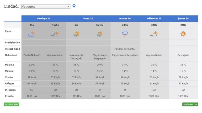 Para el domingo 24 se pronostica un día caluroso, ventoso y parcialmente nublado. La mínima durante el día será de 13 grados y la máxima de 32, con ráfagas de hasta 49 km/h.
