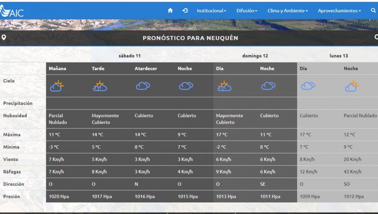 Según la Autoridad Interjurisdiccional de Cuencas, para este sábado está previsto cielo parcialmente nublado por la mañana con una máxima de 11 grados y una mínima de -3 grados. Por la tarde estará mayormente cubierto con una máxima que alcanzará los 14 grados y una mínima de 5 grados. Hacia la noche bajará a 9 y 7 grados respectivamente.