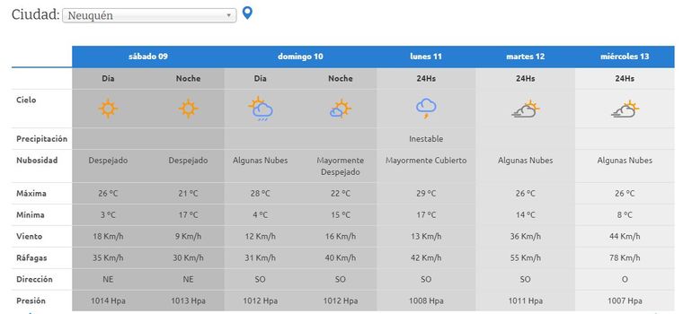 Mientras que el domingo aparecen algunas nubes con algo de inestabilidad hacía la noche, lo que podría generar algunas tormentas pasajeras en Neuquén y alrededores. La máxima irá en ascenso y podría superar los 28 grados.
