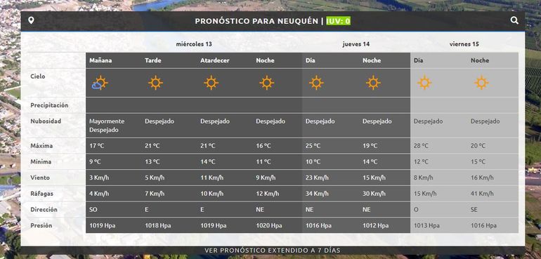 Para el inicio de la Semana Santa habrá tiempo bueno, soleado y con ascenso de la temperatura. Se espera una máxima de 25 grados y una mínima de 10 grados durante el día. Hacia la noche, la máxima descenderá a los 19 grados y la mínima a los 14 grados. El viento, proveniente del noreste, será leve y las ráfagas alcanzarán los 34 kilómetros por hora.