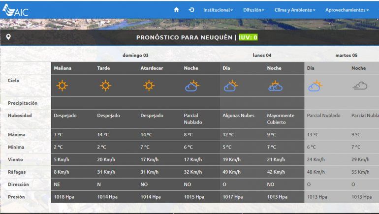 La Autoridad Interjurisdiccional de las Cuencas (AIC) pronosticó para esta mañana cielo soleados durante la mañana con una temperatura mínima de 2 grados y una máxima de 7 grados. Por la tarde seguirá soleado, con una temperatura que ascenderá a 14 grados, mientras que por la noche el cielo estará parcialmente nublado con una máxima que descenderá a 8 grados y una mínima a 6 grados. El viento será leve todo el día, con ráfagas de hasta 32 kilómetros por hora hacia la noche.