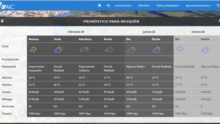 Según la Autoridad Interjurisdiccional de las Cuencas (AIC), para hoy se espera sol y calor hasta que llegue el viento del oeste que se mantiene el jueves. Estará inestable en cordillera y, por períodos, en el resto de la región. Habrá tiempo bueno el fin de semana.