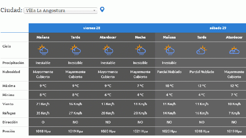En Villa La Angostura se esperan precipitaciones durante el viernes y el sábado, con mejoras para el domingo y lunes, y temperaturas que variarán entre los 3º y los 18º. Los vientos serán leves del sector norte.