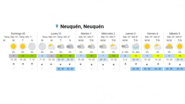 El ascenso de la temperatura continuará el viernes, en donde la mínima será de 9°C y la máxima de 19°C. El cielo pasará de despejado a parcialmente nublado. Las ráfagas de viento alcanzarán los 50 km/h. Por último, el sábado se presentará muy similar a la jornada anterior. Mientras la temperatura oscilará entre 9°C y 18°C, las ráfagas mantendrán la intensidad, de 50 km/h.