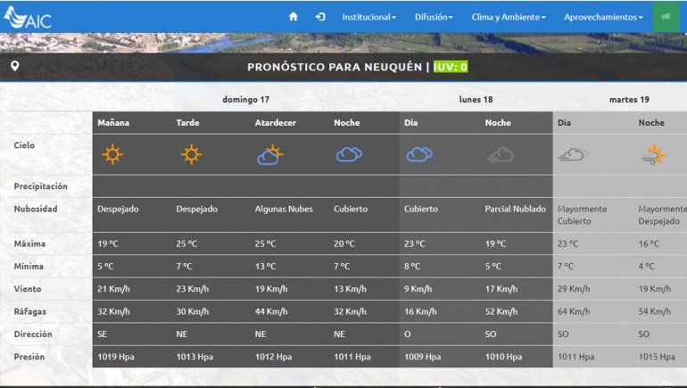 Según la Autoridad Interjurisdiccional de las Cuencas (AIC), por la mañana estará despejado y la temperatura máxima será de 19 grados y la mínima de 5 grados. Durante el atardecer alcanzará una máxima de 25 grados y una mínima de 23 grados con cielo algo nublado, mientras que por la noche descenderán a una máxima de 20 grados y una mínima de 7 grados con cielo cubierto.
