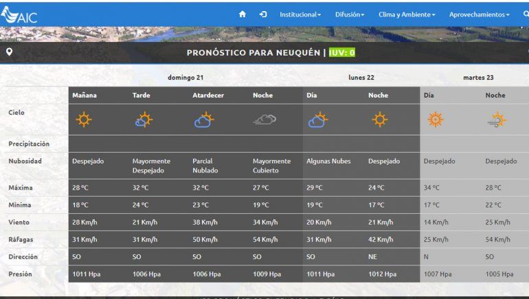Según la Autoridad Interjurisdiccional de las Cuencas (AIC), persiste el calor en el norte de la Patagonia, con períodos de viento del sudoeste por las tardes en la región, condiciones que se mantendrán durante los próximos días.