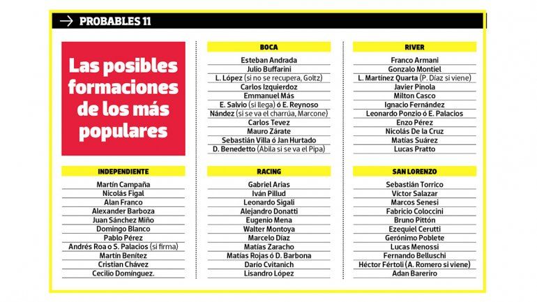 El Millo practicamente no sufrió variantes y encarará el inicio con el mismo equipo que culminó (ver aparte las formaciones). Mantuvo a las figuras y aún no se reforzó. Espera la llegada del defensor chileno Paulo Díaz, quien si llega sería titular. En tanto, el 11 xeneize tampoco sufriría grandes modificaciones, si bien incorporó al delantero venezolano Jan Hurtado, a Alexis Mac Allister y está al caer Toto Salvio, el único que sería titular de entrada. Habrá que ver qué pasa, eso sí con Benedetto y Nández, que tienen ofertas de Francia e Italia.